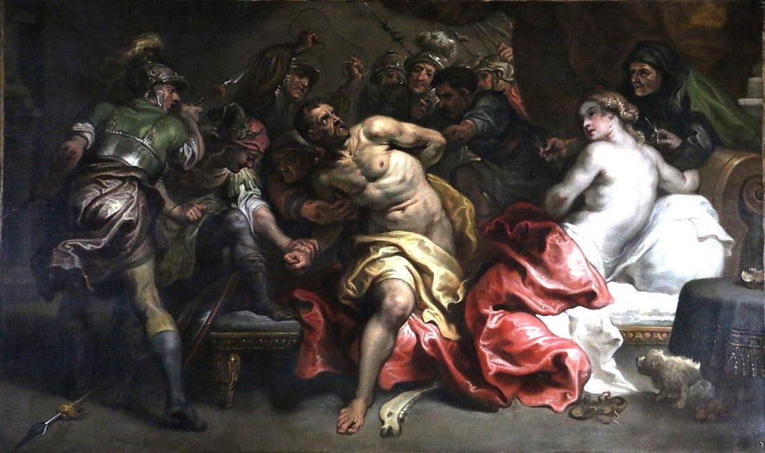 After three false starts, Samson finally tells Delilah the source of his power is in his hair — she proceeds to cut it all off and turn him over to the Philistines